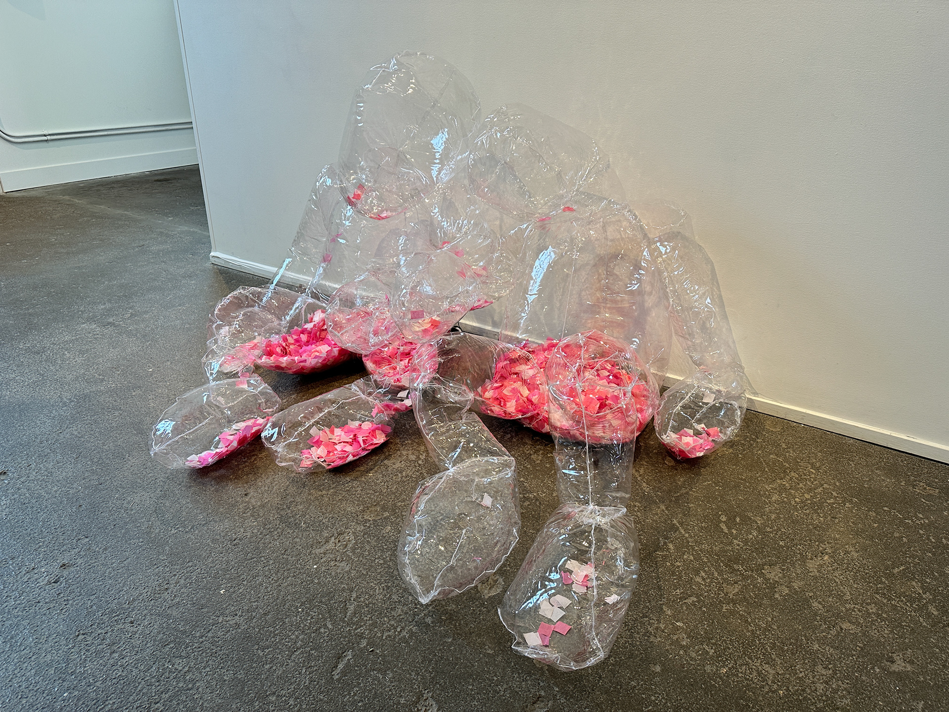The pink confetti within these figures remains in stasis, a living experience yearning for “true” liberation, a repressed affection longing to be free once more.